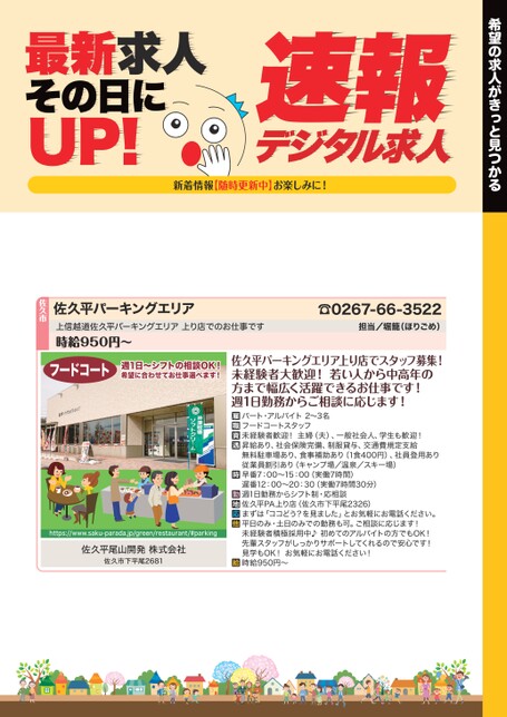 希望の求人がきっと見つかるデジタル求人速報最新求人その日にUP!新着情報【随時更新中】お楽しみに!☎0267-66-3522担当/堀籠(ほりごめ)佐久平パーキングエリア上信越道佐久平パーキングエリア上り店でのお仕事です時給950円〜佐久市フードコート週1日〜シフトの相談OK!希望に合わせてお仕事選べます!https://www.saku-parada.jp/green/restaurant/#parking佐久平尾山開発株式会社佐久市下平尾2681佐久平パーキングエリア上り店でスタッフ募集!未経験者大歓迎!若い人から中高年の方まで幅広く活躍できるお仕事です!週1日勤務からご相談に応じます!パート・アルバイト2〜3名フードコートスタッフ未経験者歓迎!主婦(夫)、一般社会人、学生も歓迎!昇給あり、社会保険完備、制服貸与、交通費規定支給無料駐車場あり、食事補助あり(1食400円)、社員登用あり従業員割引あり(キャンプ場/温泉/スキー場)早番7:00〜15:00(実働7時間)遅番12:00〜20:30(実働7時間30分)週1日勤務からシフト制・応相談佐久平PA上り店(佐久市下平尾2326)まずは「ココどう?を見ました」とお気軽にお電話ください。平日のみ・土日のみでの勤務も可。ご相談に応じます!未経験者積極採用中♪初めてのアルバイトの方でもOK!先輩スタッフがしっかりサポートしてくれるので安心です!見学もOK!お気軽にお電話ください!時給950円〜