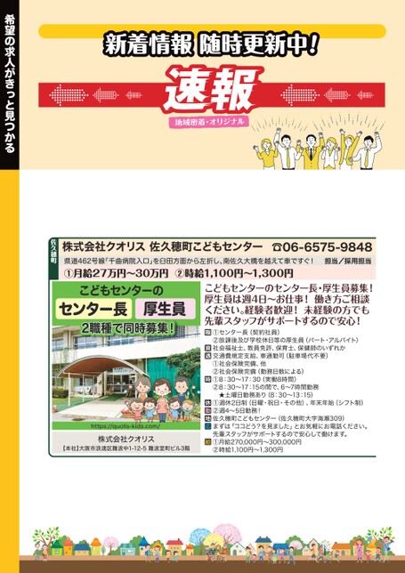 新着情報随時更新中!株式会社クオリス佐久穂町こどもセンター☎06-6575-9848県道462号線「千曲病院入口」を臼田方面から左折し、南佐久大橋を越えて車ですぐ!①月給27万円〜30万円②時給1,100円〜1,300円担当/採用担当佐久穂町希望の求人がきっと見つかるこどもセンターのセンター長厚生員2職種で同時募集!https://quolis-kids.com/株式会社クオリス【本社】大阪市浪速区難波中1-12-5難波室町ビル3階こどもセンターのセンター長・厚生員募集!厚生員は週4日〜お仕事!働き方ご相談ください。経験者歓迎!未経験の方でも先輩スタッフがサポートするので安心!①センター長(契約社員)②放課後及び学校休日等の厚生員(パート・アルバイト)社会福祉士、教員免許、保育士、保健師のいずれか交通費規定支給、車通勤可(駐車場代不要)①社会保険完備、他②社会保険完備(勤務日数による)①8:30〜17:30(実働8時間)②8:30〜17:15の間で、6〜7時間勤務★土曜日勤務あり(8:30〜13:15)①週休2日制(日曜・祝日・その他)、年末年始(シフト制)②週4〜5日勤務!佐久穂町こどもセンター(佐久穂町大字海瀬309)まずは「ココどう?を見ました」とお気軽にお電話ください。先輩スタッフがサポートするので安心して働けます。①月給270,000円〜300,000円②時給1,100円〜1,300円
