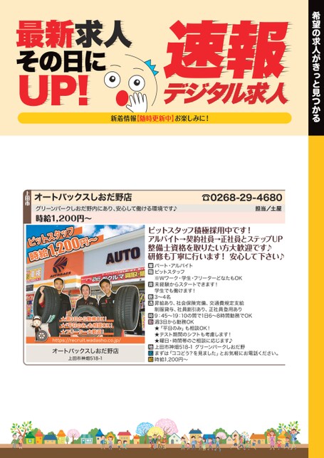 希望の求人がきっと見つかるデジタル求人速報最新求人その日にUP!新着情報【随時更新中】お楽しみに!☎0268-29-4680担当/土屋オートバックスしおだ野店グリーンパークしおだ野内にあり、安心して働ける環境です♪時給1,200円〜上田市ッフ00タ,2ス1ト給ッピ時〜円★週3日から勤務OK!★★フリーター大歓迎!「平日のみ」も相談OK!https://recruit.wadasho.co.jp/オートバックスしおだ野店上田市神畑518-1ピットスタッフ積極採用中です!アルバイト→契約社員→正社員とステップUP整備士資格を取りたい方大歓迎です♪研修も丁寧に行います!安心して下さい♪パート・アルバイトピットスタッフ※Wワーク・学生・フリーターどなたもOK未経験からスタートできます!学生でも働けます!3〜4名昇給あり、社会保険完備、交通費規定支給制服貸与、社員割引あり、正社員登用あり9:45〜19:10の間で1日6〜8時間勤務でOK週3日から勤務OK★「平日のみ」も相談OK!★テスト期間のシフトも考慮します!★曜日・時間帯のご相談に応じます♪上田市神畑518-1グリーンパークしおだ野まずは「ココどう?を見ました」とお気軽にお電話ください。時給1,200円〜