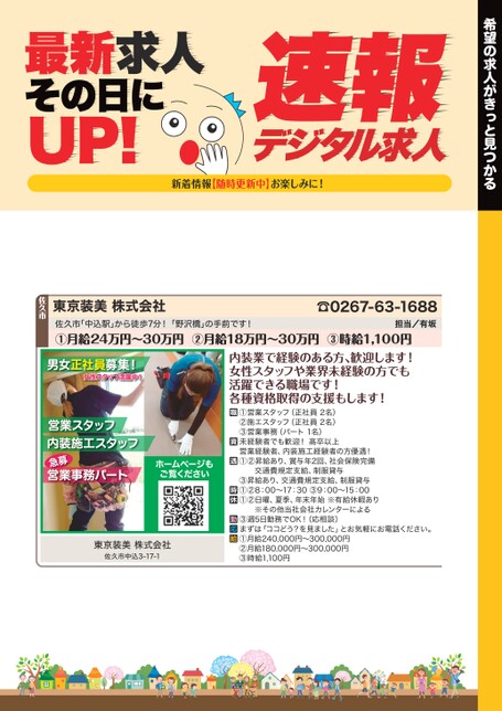 希望の求人がきっと見つかるデジタル求人速報新着情報【随時更新中】お楽しみに!最新求人その日にUP!☎0267-63-1688担当/有坂佐久市「中込駅」から徒歩7分!「野沢橋」の手前です!①月給24万円〜30万円②月給18万円〜30万円③時給1,100円内装業で経験のある方、歓迎します!女性スタッフや業界未経験の方でも活躍できる職場です!各種資格取得の支援もします!男女正社員募集!女性スタッフ活躍中!営業スタッフ内装施工スタッフ急営業事務パート募ホームページもご覧ください東京装美株式会社佐久市中込3-17-1①営業スタッフ(正社員2名)②施エスタッフ(正社員2名)③営業事務(パート1名)未経験者でも歓迎!高卒以上営業経験者、内装施工経験者の方優遇!①②昇給あり、賞与年2回、社会保険完備交通費規定支給、制服貸与③昇給あり、交通費規定支給、制服貸与①②8:00〜17:30③9:00〜15:00①②日曜、夏季、年末年始※有給休暇あり※その他当社会社カレンターによる③週5日勤務でOK!(応相談)まずは「ココどう?を見ました」とお気軽にお電話ください。①月給240,000円〜300,000円②月給180,000円〜300,000円③時給1,100円東京装美株式会社佐久市