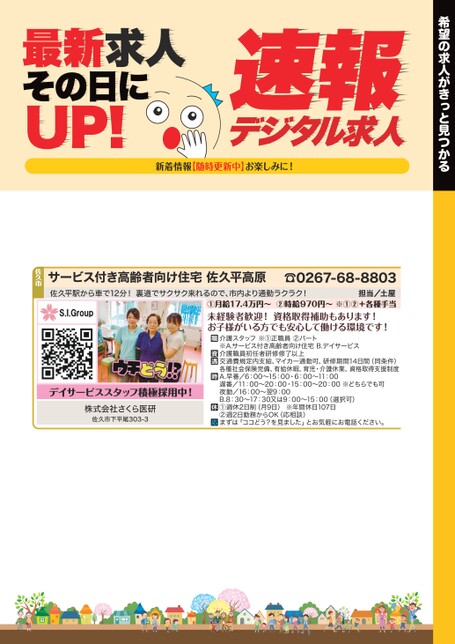 希望の求人がきっと見つかるデジタル求人速報最新求人その日にUP!新着情報【随時更新中】お楽しみに!☎0267-68-8803担当/土屋①月給17.4万円〜②時給970円〜※①②+各種手当未経験者歓迎!資格取得補助もあります!お子様がいる方でも安心して働ける環境です!佐久平駅から車で12分!裏道でサクサク来れるので、市内より通勤ラクラク!サービス付き高齢者向け住宅佐久平高原佐久市デイサービススタッフ積極採用中!株式会社さくら医研佐久市下平尾303-3介護スタッフ※①正職員②パート※A.サービス付き高齢者向け住宅B.デイサービス介護職員初任者研修修了以上交通費規定内支給、マイカー通勤可、研修期間14日間(同条件)各種社会保険完備、有給休暇、育児・介護休業、資格取得支援制度A.早番/6:00〜15:00・6:00〜11:00遅番/11:00〜20:00・15:00〜20:00※どちらでも可夜勤/16:00〜翌9:00B.8:30〜17:30又は9:00〜15:00(選択可)①週休2日制(月9日)※年間休日107日②週2日勤務からOK(応相談)まずは「ココどう?を見ました」とお気軽にお電話ください。