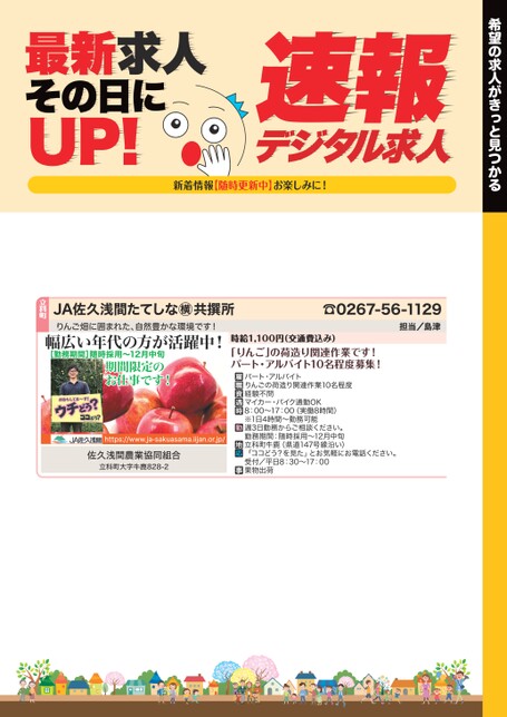 希望の求人がきっと見つかるデジタル求人速報新着情報【随時更新中】お楽しみに!最新求人その日にUP!☎0267-56-1129担当/島津時給1,100円(交通費込み)「りんご」の荷造り関連作業です!パート・アルバイト10名程度募集!パート・アルバイトりんごの荷造り関連作業10名程度経験不問マイカー・バイク通勤OK8:00〜17:00(実働8時間)※1日4時間〜勤務可能週3日勤務からご相談ください。勤務期間:随時採用〜12月中旬立科町牛鹿(県道147号線沿い)「ココどう?を見た」とお気軽にお電話ください。受付/平日8:30〜17:00果物出荷JA佐久浅間たてしな○横共所りんご畑に囲まれた、自然豊かな環境です!幅広い年代の方が活躍中!立科町[勤務期間]随時採用〜12月中旬期間限定のお仕事です!https://www.ja-sakuasama.iijan.or.jp/佐久浅間農業協同組合立科町大字牛鹿828-2