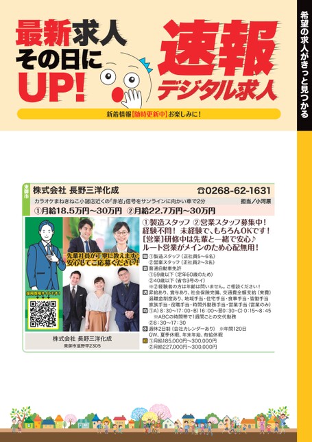 希望の求人がきっと見つかるデジタル求人速報最新求人その日にUP!新着情報【随時更新中】お楽しみに!☎0268-62-1631担当/小河原カラオケまねきねこ小諸店近くの「赤岩」信号をサンラインに向かい車で2分①月給18.5万円〜30万円②月給22.7万円〜30万円株式会社長野三洋化成東御市①製造スタッフ②営業スタッフ募集中!経験不問!未経験で、もちろんOKです![営業]研修中は先輩と一緒で安心♪ルート営業がメインのため心配無用!先輩社員が丁寧に教えます♪安心してご応募ください!採用専用サイトです!株式会社長野三洋化成東御市滋野甲2305①製造スタッフ(正社員5〜6名)②営業スタッフ(正社員2〜3名)普通自動車免許①59歳以下(定年60歳のため)②40歳以下(省令3号のイ)※②経験者の方は年齢は問いません。ご相談ください!昇給あり、賞与あり、社会保険完備、交通費全額支給(実費)退職金制度あり、地域手当・住宅手当・食事手当・皆勤手当家族手当・役職手当・時間外勤務手当・営業手当(営業のみ)①A)8:30〜17:00・B)16:00〜翌0:30・C)0:15〜8:45※ABCの時間帯で1週間ごとの交代勤務②8:30〜17:30週休2日制(会社カレンダーあり)※年間120日GW、夏季休暇、年末年始、有給休暇①月給185,000円〜300,000円②月給227,000円〜300,000円