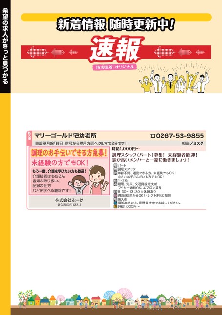 新着情報随時更新中!☎0267-53-9855担当/ミスダ時給1,000円〜調理スタッフ(パート)募集!未経験者歓迎!志が高いメンバーと一緒に働きましょう!パート調理スタッフ年齢不問、通勤できる方、未経験でもOK!小さいお子さんがいる方でもOK!1〜2名雇用、労災、交通費規定支給マイカー通勤OK、エプロン貸与8:30〜13:30※休憩あり週3日勤務からOK!(シフト制)応相談佐久市電話連絡の上、履歴書持参でお越しください。時給1,000円〜マリーゴールド宅幼老所東部望月線「畔田」信号から望月方面へクルマで2分です!調理のお手伝いできる方急募!未経験の方でもOK!もう一度、介護を学びたい方も歓迎!介護技術はもちろん書類の取り扱い、記録の仕方などを学べる職場です!株式会社ぶーけ佐久市印内133-1佐久市希望の求人がきっと見つかる