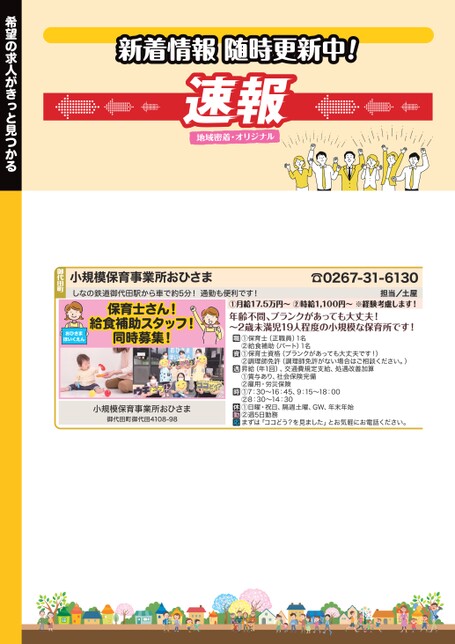小規模保育事業所おひさましなの鉄道御代田駅から車で約5分!通勤も便利です!保育士さん!給食補助スタッフ!おひさまほいくえん同時募集!小規模保育事業所おひさま御代田町御代田4108-98☎0267-31-6130担当/土屋①月給17.5万円〜②時給1,100円〜※経験考慮します!年齢不問、ブランクがあっても大丈夫!〜2歳未満児19人程度の小規模な保育所です!①保育士(正職員)1名②給食補助(パート)1名①保育士資格(ブランクがあっても大丈夫です!)②調理師免許(調理師免許がない場合はご相談ください。)昇給(年1回)、交通費規定支給、処遇改善加算①賞与あり、社会保険完備②雇用・労災保険①7:30〜16:45、9:15〜18:00②8:30〜14:30①日曜・祝日、隔週土曜、GW、年末年始②週5日勤務まずは「ココどう?を見ました」とお気軽にお電話ください。新着情報随時更新中!御代田町希望の求人がきっと見つかる