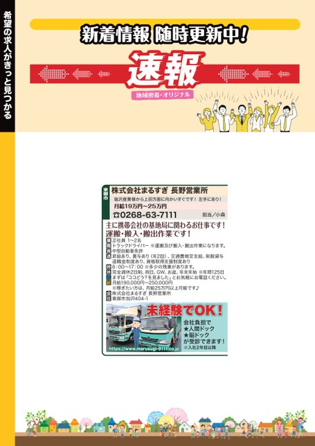 ☎0268-63-7111担当/小森主に携帯会社の基地局に関わるお仕事です!運搬・搬入・搬出作業です!正社員1〜2名トラックドライバー※運搬及び搬入・搬出作業になります。中型自動車免許昇給あり、賞与あり(年2回)、交通費規定支給、制服貸与退職金制度あり、資格取得支援制度あり8:00〜17:00※多少の残業があります。完全週休2日制、祝日、GW、お盆、年末年始※年間125日まずは「ココどう?を見ました」とお気軽にお電話ください。月給190,000円〜250,000円※稼ぎたい方は、月給25万円以上可能です♪株式会社まるすぎ長野営業所東御市加沢404-1未経験でOK!株式会社まるすぎ長野営業所塩沢産業様から上田方面に向かいすぐです!左手にあり!月給19万円〜25万円東御市会社負担で★人間ドック★脳ドックが受診できます!※入社2年目以降https://www.marusugi-9111.co.jp新着情報随時更新中!希望の求人がきっと見つかる