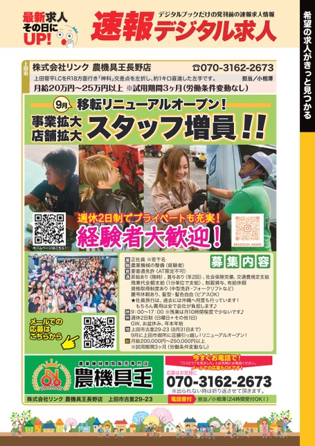 希望の求人がきっと見つかる最新求人その日にUP!速報発刊前の速報求人情報デジタルブックだけのデジタル求人上田菅平I.CをR18方面行き「神科」交差点を左折し、約1キロ直進した左手です。月給20万円〜25万円以上※試用期間3ヶ月(労働条件変動なし)担当/小相澤☎070-3162-2673株式会社リンク農機具王長野店上田市9月事業拡大店舗拡大移転リニューアルオープン!スタッフ増員!!週休2日制でプライベートも充実!経験者大歓迎!ホームページはこちら!募集内容正社員※若干名農業機械の整備(経験者)要普通免許(AT限定不可)昇給あり(随時)、賞与あり(年2回)、社会保険完備、交通費規定支給残業代全額支給(1分単位で支給)、制服貸与、有給休暇資格取得制度あり(中型免許・フォークリフトなど)慶弔休暇あり、髪型・髪色自由(ピアスOK)★社員旅行は、過去には沖縄へ何度も行っています!もちろん費用は全て会社が負担します♪9:00〜17:00※残業は月10時間程度で少ないです♪週休2日制(日曜日+その他1日)GW、お盆休み、年末年始上田市古里29-23(8月31日まで)9月に上田市御所に店舗引っ越し!リニューアルオープン!月給200,000円〜250,000円以上※試用期間3ヶ月(労働条件変動なし)メールでの応募はこちらから株式会社リンク農機具王長野店上田市古里29-23今すぐお電話で!「ココどう?を見ました」とお気軽にお電話ください。メールでの応募もOKです!応募はお気軽に070-3162-2673※出られない時は折り返させて頂きます。電話受付担当/小相澤(24時間受付OK!)