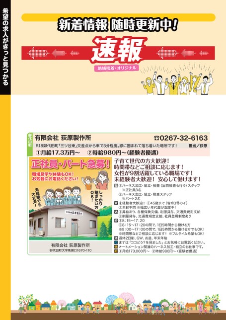 有限会社荻原製作所☎0267-32-6163担当/荻原子育て世代の方大歓迎!時間帯などご相談に応じます!女性が9割活躍している職場です!未経験者大歓迎!安心して働けます!①ハーネス加工・組立・検査(出荷検査も行う)スタッフ※正社員3名②ハーネス加工・組立・検査スタッフ※パート2名未経験者大歓迎!①45歳まで(省令3号のイ)②年齢不問※幅広い年代層が活躍中!①昇給あり、各種保険完備、制服貸与、交通費規定支給②制服貸与、交通費規定支給、社員登用制度あり①8:15〜17:20②8:15〜17:20の間で、1日5時間から働ける方※9:00〜17:00の間で、1日5時間から働ける方でもOK!※時間帯などご相談に応じます!※フルタイム希望もOK!週休2日制、GW、お盆、年末年始まずは「ココどう?を見ました」とお気軽にお電話ください。オートメーション関連のハーネス加工・組立のお仕事です。①月給173,000円〜②時給980円〜(経験者優遇)正社員・パート急募!職場見学や体験もOK!お気軽にお電話ください!しっかり稼ぎたい方OK!未経験でも大丈夫!有限会社荻原製作所御代田町大字馬瀬口1670-110R18御代田町「三ツ谷東」交差点から車で3分程度。緑に囲まれて落ち着いた場所です!①月給17.3万円〜②時給980円〜(経験者優遇)新着情報随時更新中!御代田町希望の求人がきっと見つかる