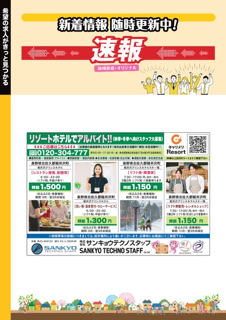 リゾートホテルでアルバイト!!(秋季・冬季へ向けスタッフ大募集)《企業様の直接雇用となります!地元出身者大活躍中!男性・女性活躍中!》ご応募はこちら受付9:00〜17:30(月〜金)東京都豊島区東池袋3丁目4番3号【池袋営業所】0120-304-777■雇用形態→直接雇用(アルバイト)■受動喫煙→施設内禁煙◆生活環境→住居完備(住込可能)◆通勤交通費→会社規定支給長野県北佐久郡軽井沢町軽井沢プリンスホテル長野県北佐久郡軽井沢町軽井沢プリンスホテルスキー場【リフト係・降雪係】7:30〜17:00(内、6H〜8H)5勤2休シフト制※夜勤有ります時給1,150円(住込み2名・食事補助)期間:11月〜翌3月末頃【レストラン接客、配膳等】6:00〜23:00(シフト制、中抜け有り)時給1,500円(住込み2名・食事補助)期間:9月〜翌3月末頃長野県北佐久郡軽井沢町軽井沢プリンスホテル【洗い場・温泉受付・ロビーサービス】6:00〜25:00(シフト制、中抜け有り)時給1,300円(住込み2名・食事補助)期間:9月〜翌3月末頃詳細は上記QRコードよりご確認下さい長野県北佐久郡軽井沢町軽井沢プリンスホテルスキー場【リフト券販売・レンタルショップ】7:30〜17:00(内、6H〜8H)5勤2休シフト制状況により変動有り時給1,150円(住込み2名・食事補助)期間:11月〜翌3月末頃※時間帯等の詳細につきましては、就労場所により違いがございます。応募時にお電話にてご確認下さい。派遣派23-300122/紹介23-ユ-300248新着情報随時更新中!希望の求人がきっと見つかる