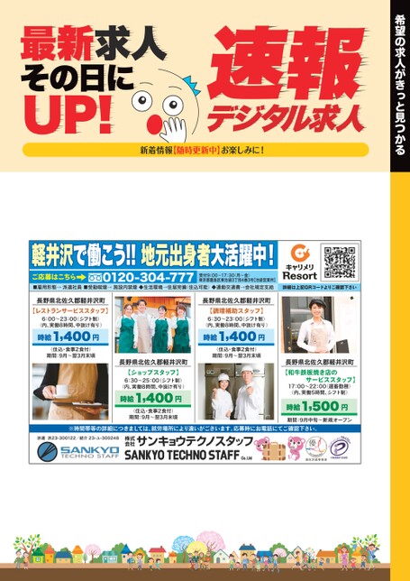 希望の求人がきっと見つかるデジタル求人速報最新求人その日にUP!新着情報【随時更新中】お楽しみに!軽井沢で働こう!!地元出身者大活躍中!受付9:00〜17:30(月〜金)東京都豊島区東池袋3丁目4番3号【池袋営業所】0120-304-777ご応募はこちら■雇用形態→派遣社員■受動喫煙→施設内禁煙◆生活環境→住居完備(住込可能)◆通勤交通費→会社規定支給詳細は上記QRコードよりご確認下さい長野県北佐久郡軽井沢町【レストランサービススタッフ】6:00〜23:00(シフト制)(内、実働8時間、中抜け有り)時給1,400円(住込・食事2食付)期間:9月〜翌3月末頃長野県北佐久郡軽井沢町【ショップスタッフ】6:30〜25:00(シフト制)(内、実働8時間、中抜け有り)時給1,400円(住込・食事2食付)期間:9月〜翌3月末頃長野県北佐久郡軽井沢町【調理補助スタッフ】6:30〜23:00(シフト制)(内、実働8時間、中抜け有り)時給1,400円(住込・食事2食付)期間:9月〜翌3月末頃長野県北佐久郡軽井沢町【和牛鉄板焼き店のサービススタッフ】17:00〜22:00(遅番勤務)(内、実働5時間、シフト制)時給1,500円期間:9月中旬〜新規オープン※時間帯等の詳細につきましては、就労場所により違いがございます。応募時にお電話にてご確認下さい。派遣派23-300122/紹介23-ユ-300248