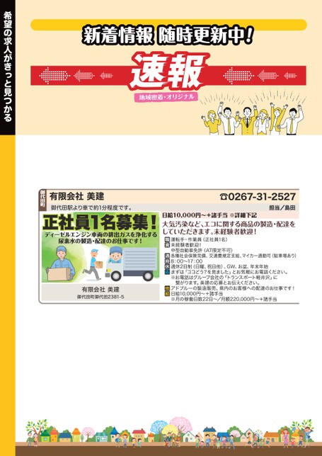 ☎0267-31-2527担当/島田日給10,000円〜+諸手当※詳細下記大気汚染など、エコに関する商品の製造・配達をしていただきます。未経験者歓迎!運転手・作業員(正社員1名)未経験者歓迎!中型自動車免許(AT限定不可)各種社会保険完備、交通費規定支給、マイカー通勤可(駐車場あり)8:00〜17:00週休2日制(日曜、祝日他)、GW、お盆、年末年始まずは「ココどう?を見ました」とお気軽にお電話ください。※お電話はグループ会社の「トランスポート軽井沢」に繋がります。美建の応募とお伝えください。アドブルーの製造販売、県内のお客様への配達のお仕事です!日給10,000円〜+諸手当※月の稼働日数22日〜/月額220,000円〜+諸手当御代田駅より車で約1分程度です。正社員1名募集!ディーゼルエンジン車両の排出ガスを浄化する尿素水の製造・配達のお仕事です!有限会社美建御代田町有限会社美建御代田町御代田2381-5新着情報随時更新中!希望の求人がきっと見つかる