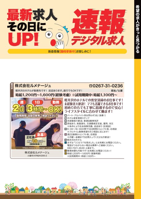 希望の求人がきっと見つかるデジタル求人速報最新求人その日にUP!新着情報【随時更新中】お楽しみに!軽井沢のホテルが勤務先です!送迎あります。直行でもOKです!時給1,200円〜1,600円(経験考慮)※試用期間中:時給1,100円〜担当/土屋☎0267-31-0236株式会社ルメナージュ軽井沢2週日31日時間〜勤務時間・出勤日数等ご相談ください!勤務OK!急募!正社員18万円〜月給(経験者優遇!)https://www.lemenage-t.com/株式会社ルメナージュ小諸市大字柏木299-2軽井沢のホテルでの客室清掃のお仕事です!未経験者大歓迎!ママも活躍できるお仕事です!初めての方でも丁寧に指導するので安心!ライフスタイルに合わせて働ます!パート・アルバイト男女問わず3名(急募!)ホテル客室清掃スタッフ未経験者大歓迎、普通自動車免許昇給あり、制服貸与、交通費規定支給、雇用、労災※条件により社会保険完備、送迎あり(応相談)9:00〜16:00の間で1日3時間からシフト制、応相談※フルタイム勤務希望の方ご相談に応じます!週2日勤務からシフト制、応相談※月曜〜金曜まで5日間入ってくださる方歓迎!軽井沢のホテルまずは「ココどう?を見ました」とお気軽にお電話ください。電話がつながらない場合は携帯へご連絡ください。080-7221-4649土屋まで。職場体験も可能です!お気軽にお電話ください!時給1,200円〜1,600円(経験考慮)※試用期間中:時給1,100円〜