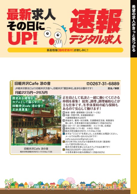 希望の求人がきっと見つかるデジタル求人速報最新求人その日にUP!新着情報【随時更新中】お楽しみに!☎0267-31-6889担当/原JR軽井沢駅北口より旧軽井沢方面へ。旧軽井沢「諏訪神社」徒歩5分圏内です!月給22万円〜26万円旧軽井沢Cafe涼の音軽井沢歴史ある建物をカフェとして蘇らせた旧軽井沢cafe涼の音で正社員募集!https://suzunone.main.jp/旧軽井沢Cafe涼の音軽井沢町旧軽井沢972ハウスNo.1138正社員として私達と一緒に働いてくださる仲間を募集!接客、調理、調理補助などが主な仕事です。冬季休業時の給与保障もあるので安心して働けます!接客・調理・調理補助(正社員1〜2名)年齢・学歴不問、未経験者歓迎!※調理経験あれば尚可昇給あり、雇用・労災保険、交通費規定支給、制服貸与賄いあり、冬季休業中の給与保障あり(月給の60%)8:00〜17:30(実働8時間)※シフト制、応相談週休2日制(シフト制)※休日:月8日軽井沢町旧軽井沢972ハウスNo.1138まずは「ココどう?を見ました」とお気軽にお電話ください。メールでのお問い合わせもOKです!cafe.suzunone@gmail.com2013年7月に文化庁より登録有形文化財(建造物)として認可を受けました。軽井沢の歴史を感じられるカフェでのお仕事です!月給220,000円〜260,000円※冬季休業中の給与保障あり(月給の60%)