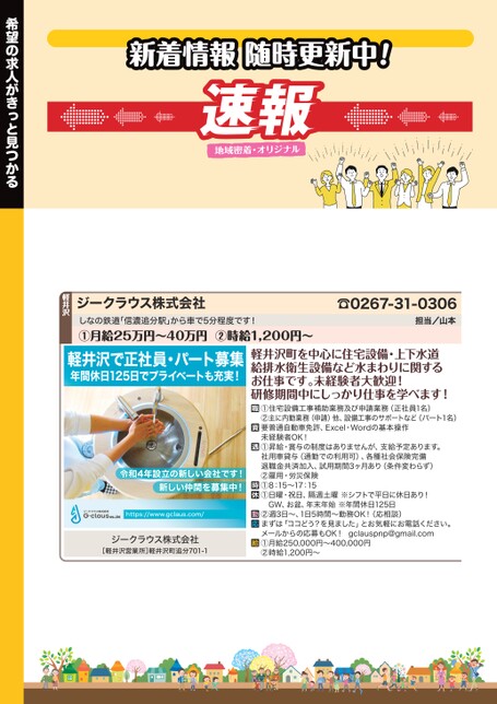 ☎0267-31-0306担当/山本ジークラウス株式会社しなの鉄道「信濃追分駅」から車で5分程度です!①月給25万円〜40万円②時給1,200円〜軽井沢軽井沢で正社員・パート募集年間休日125日でプライベートも充実!令和4年設立の新しい会社です!新しい仲間を募集中!https://www.gclaus.com/ジークラウス株式会社[軽井沢営業所]軽井沢町追分701-1軽井沢町を中心に住宅設備・上下水道給排水衛生設備など水まわりに関するお仕事です。未経験者大歓迎!研修期間中にしっかり仕事を学べます!①住宅設備工事補助業務及び申請業務(正社員1名)②主に内勤業務(申請)他、設備工事のサポートなど(パート1名)要普通自動車免許、Excel・Wordの基本操作未経験者OK!①昇給・賞与の制度はありませんが、支給予定あります。社用車貸与(通勤での利用可)、各種社会保険完備退職金共済加入、試用期間3ヶ月あり(条件変わらず)②雇用・労災保険①8:15〜17:15①日曜・祝日、隔週土曜※シフトで平日に休日あり!GW、お盆、年末年始※年間休日125日②週3日〜、1日5時間〜勤務OK!(応相談)まずは「ココどう?を見ました」とお気軽にお電話ください。メールからの応募もOK!gclauspnp@gmail.com①月給250,000円〜400,000円②時給1,200円〜新着情報随時更新中!希望の求人がきっと見つかる