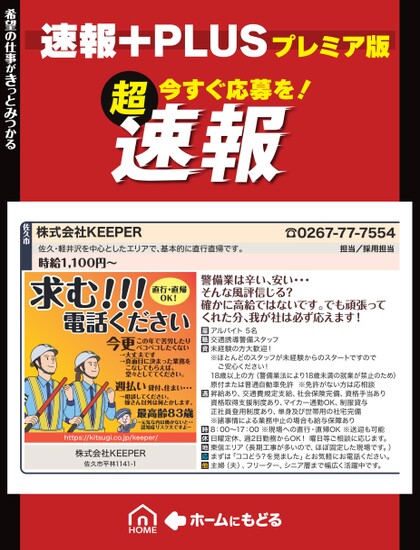 速報+PLUSプレミア版今すぐ応募を!超株式会社KEEPER佐久・軽井沢を中心としたエリアで、基本的に直行直帰です。時給1,100円〜☎0267-77-7554担当/採用担当希望の仕事がきっとみつかる佐久市求む!!!直行・直帰OK!電話ください今更この年で苦労したりペコペコしたくない→大丈夫です→真面目に決まった業務をこなしてもらえば、堂々としててください。週払い貸付、住まい・・・→相談してください。嫁さん以外は何とかします。最高齢83歳→元気な内は働かないと・・認知症リスク大ですよーhttps://kitsugi.co.jp/keeper/株式会社KEEPER佐久市平林1141-1警備業は辛い、安い・・・そんな風評信じる?確かに高給ではないです。でも頑張ってくれた分、我が社は必ず応えます!アルバイト5名交通誘導警備スタッフ未経験の方大歓迎!※ほとんどのスタッフが未経験からのスタートですのでご安心ください!18歳以上の方(警備業法により18歳未満の就業が禁止のため)原付または普通自動車免許※免許がない方は応相談昇給あり、交通費規定支給、社会保険完備、資格手当あり資格取得支援制度あり、マイカー通勤OK、制服貸与正社員登用制度あり、単身及び世帯用の社宅完備※諸事情による業務中止の場合も給与保障あり8:00〜17:00※現場への直行・直帰OK※送迎も可能日曜定休、週2日勤務からOK!曜日等ご相談に応じます。東信エリア(長期工事が多いので、ほぼ固定した現場です。)まずは「ココどう?を見ました」とお気軽にお電話ください。主婦(夫)、フリーター、シニア層まで幅広く活躍中です。