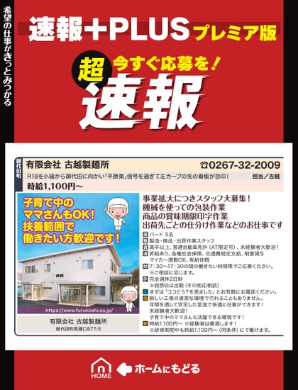 速報+PLUSプレミア版今すぐ応募を!超有限会社古越製麺所☎0267-32-2009担当/古越R18を小諸から御代田に向かい「平原東」信号を過ぎて左カーブの先の看板が目印!時給1,100円〜子育て中のママさんもOK!扶養範囲で働きたい方歓迎です!https://www.furukoshi.co.jp/有限会社古越製麺所御代田町馬瀬口877-5事業拡大につきスタッフ大募集!機械を使っての包装作業商品の賞味期限印字作業出荷先ごとの仕分け作業などのお仕事ですパート5名製造・検品・出荷作業スタッフ高卒以上、普通自動車免許(AT限定可)、未経験者大歓迎!昇給あり、各種社会保険、交通費規定支給、制服貸与マイカー通勤OK、有給休暇7:30〜17:30の間の働きたい時間帯でご応募ください。※ご相談に応じます。完全週休2日制※祝祭日は出勤(その他応相談)まずは「ココどう?を見ました」とお気軽にお電話ください。新しい工場の清潔な環境で汚れることもありません。年間を通して安定した室温で快適に仕事ができます!未経験者大歓迎!子育て中のママさんも活躍できる環境です!時給1,100円〜※経験者は優遇します!※研修期間中も時給1,100円〜(同条件)にて働けます。希望の仕事がきっとみつかる御代田町