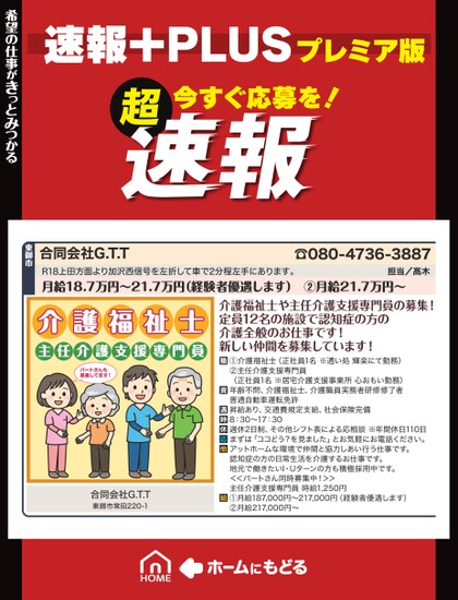 速報+PLUSプレミア版今すぐ応募を!超合同会社G.T.T☎080-4736-3887R18上田方面より加沢西信号を左折して車で2分程左手にあります。月給18.7万円〜21.7万円(経験者優遇します)②月給21.7万円〜担当/髙木介護福祉士主任介護支援専門員パートさんも募集してます!合同会社G.T.T東御市常田220-1介護福祉士や主任介護支援専門員の募集!定員12名の施設で認知症の方の介護全般のお仕事です!新しい仲間を募集しています!①介護福祉士(正社員1名※通い処輝楽にて勤務)②主任介護支援専門員(正社員1名※居宅介護支援事業所心おもい勤務)年齢不問、介護福祉士、介護職員実務者研修修了者普通自動車運転免許昇給あり、交通費規定支給、社会保険完備8:30〜17:30週休2日制、その他シフト表による応相談※年間休日110日まずは「ココどう?を見ました」とお気軽にお電話ください。アットホームな環境で仲間と協力しあい行う仕事です。認知症の方の日常生活を介護するお仕事です。地元で働きたいI・Uターンの方も積極採用中です。<<パートさん同時募集中!>>主任介護支援専門員時給1,250円①月給187,000円〜217,000円(経験者優遇します)②月給217,000円〜希望の仕事がきっとみつかる東御市